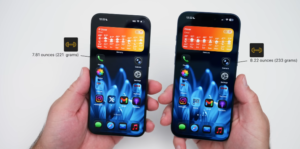 On the 15 Pro Max, there is no camera control, but we do have amillimetre wavee antenna where the new camera control is. So, everything else is the same with USBC, but the overall buttons are similar for volume and action button, but again, there is no camera control button here. Now, given that we have a material difference and different batteries and overall size, the iPhone 15 Pro Max comes in at 7.81 oz or 221 g, where the iPhone 17 Pro Max comes in at 8.22 22 oz or 233 g. So, there’s definitely a difference here. It’s definitely a much larger phone to hold, as far as the 17 Pro Max goes.